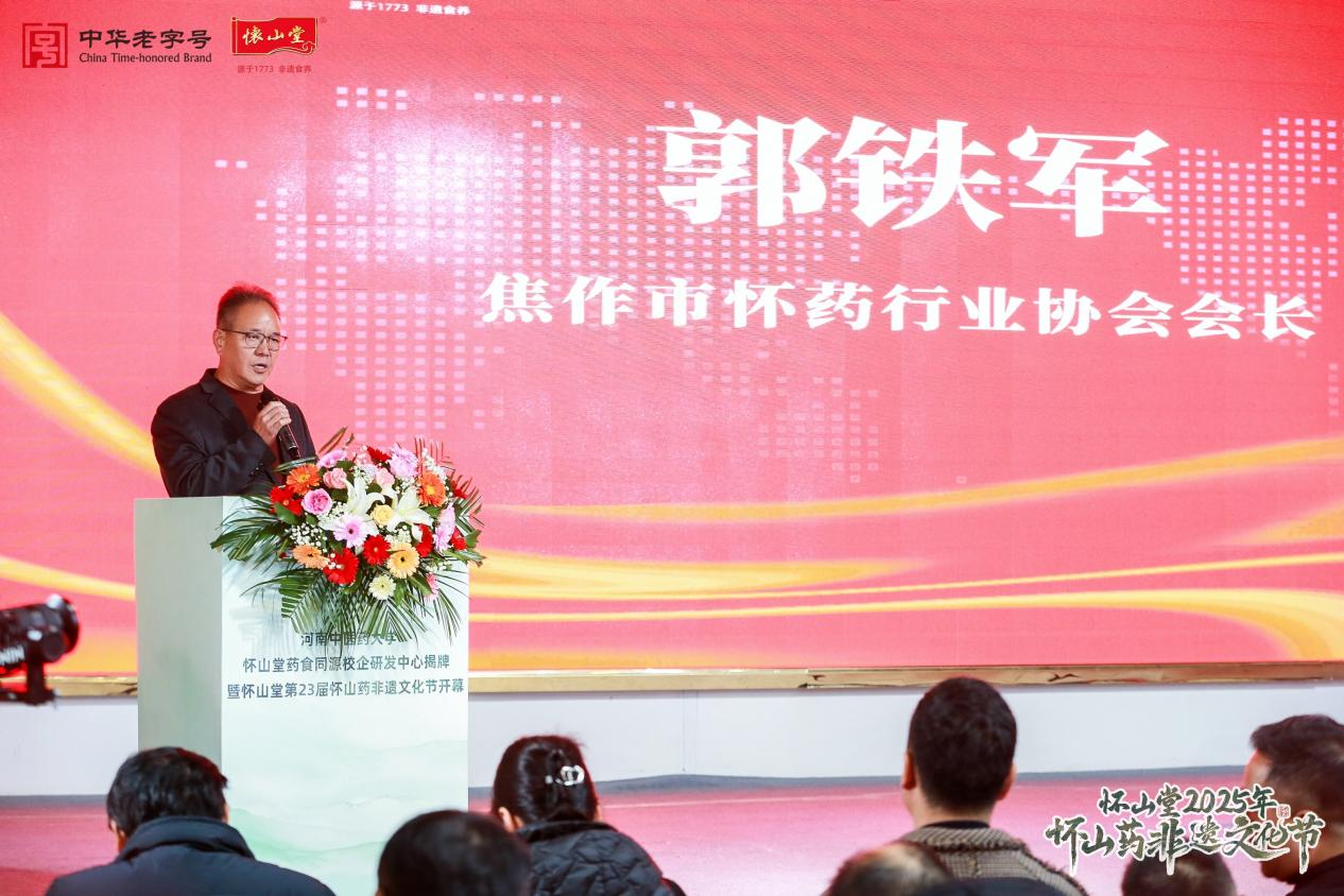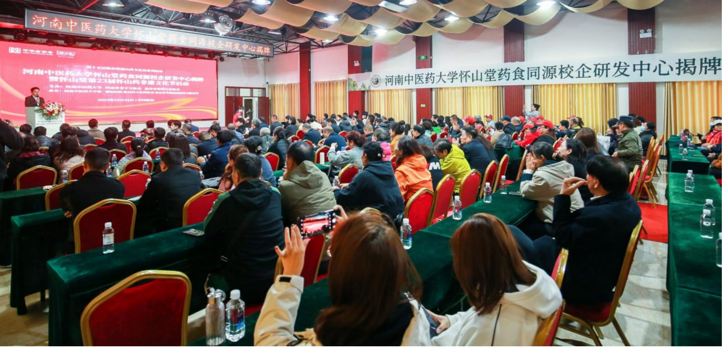 10月26日,“河南中医药大学怀山堂药食同源校企研发中心揭牌暨怀山堂第23届怀山药非遗文化节启动”活动在温县怀山堂总部举行。河南省政府参事、河南省老字号协会名誉会长赵志正,温县农业农村局副局长任小红,焦作市怀药行业协会会长郭铁军,河南省老字号协会副会长兼秘书长程振中,温县四大怀药秘书长王亚鹏,河南中医药大学第一附属医院儿童脑病诊疗康复中心副主任白青云教授、儿科脑病康复心理病区主任党伟利教授,怀山堂第九代传人、副董事长康静,河南中医药大学研发团队,中国质量报、凤凰网、中国食品安全网、央广网、河南日报、顶端新闻、网易新闻、正观新闻、河南广播(大象新闻)、河南交通广播、郑州音乐广播等媒体代表,以及200多名来自全国各地的非遗食养爱好者、怀山堂忠实消费者共同参与此次盛会。怀山堂第八代传承人康明轩出席并致欢迎辞。