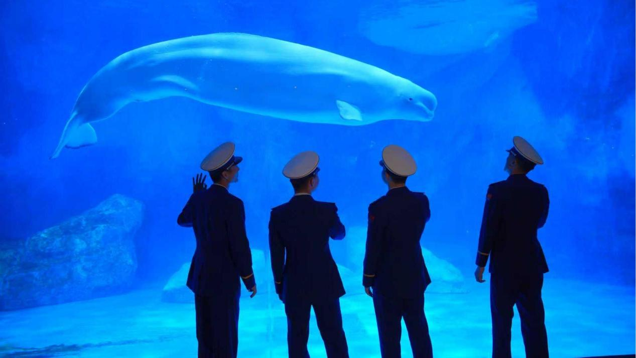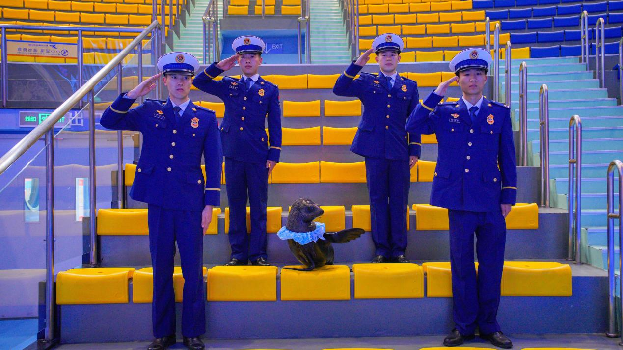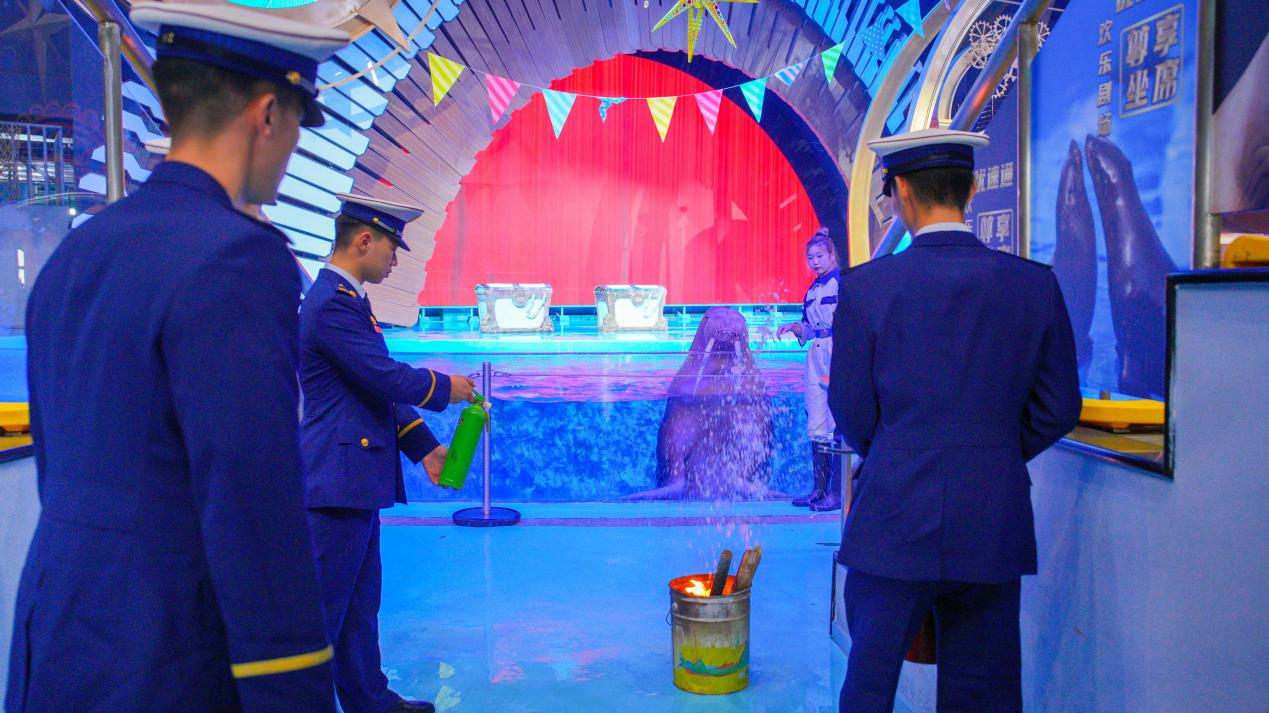 消防员与海洋动物之间的温情互动也吸引了众多游客的关注。近两个月大的帝企鹅宝宝完成了与“蓝朋友”的首次会面,未满周岁的小海狗“吉米”有模有样地向消防员“敬礼”,海豚与白鲸则以亲吻、鼓掌等方式传递来自海洋的欢喜。这场跨越物种的“蓝色对话”,不仅传递出消防员铁汉柔情的温度,也通过动物行为展示与互动体验,潜移默化地普及了海洋生态知识,科普消防知识的同时,增强了游客对海洋环境保护的认同。