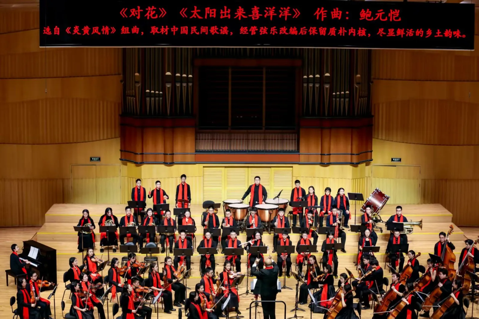 下半场则聚焦中国作品,形成鲜明的情感纵深。《红色娘子军组曲》选段《序曲》《军民联欢》的革命激情与鱼水情深,《织网》《丰收》的乡土生活图景,以及《对花》《太阳出来喜洋洋》等民歌的新编,在舞台上焕发出中国文化的艺术感染力。这些作品不仅勾勒出中国现当代音乐的发展脉络,更体现了学校艺术教育从校园走向更广阔天地的成长轨迹。