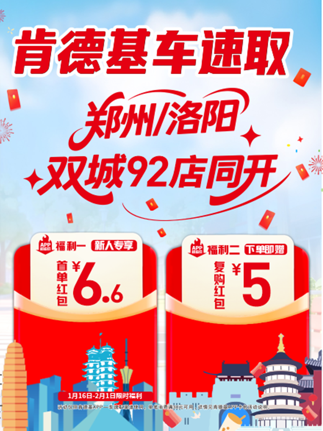 “我知道大家都赶时间,尤其是春运赶路的车主,咱开车不着急那一会,用肯德基车速取,麻利得很,取完就走,通勤、赶路、游玩的时间肯德基帮我们省出来,还能不饿肚子。” 一句消费者的体验总结,精准道出了车速取服务的核心优势。这项服务不仅破解了驾车人群的就餐难题,更成为春节旅游城市的贴心保障,传递出便捷高效的生活理念。即日起,郑州、洛阳的消费者只需打开肯德基 APP,选择 “车速取” 服务下单,就能享受免下车、快取餐的便捷体验,以高效出行姿态开启新年新旅程。恰逢春运与新年双节点,肯德基车速取新年专属福利同步上线(以下优惠仅限在肯德基APP,车速取渠道使用):1 月 16 日至 2 月 1 日,用户下单可享三重福利 —— 指定小食 5 元畅享、早餐 6 折优惠、午晚餐 7 折购四件套。新用户福利加码,打开肯德基 APP 定位郑州或洛阳,即可领取 30 元减 6.6 元车速取专享红包;所有用户在车速取渠道下单并完成取餐后,还能获得 5 元复购红包,每人每天限领 1 张,活动期间最多可领 4 张,福利有限,送完即止。