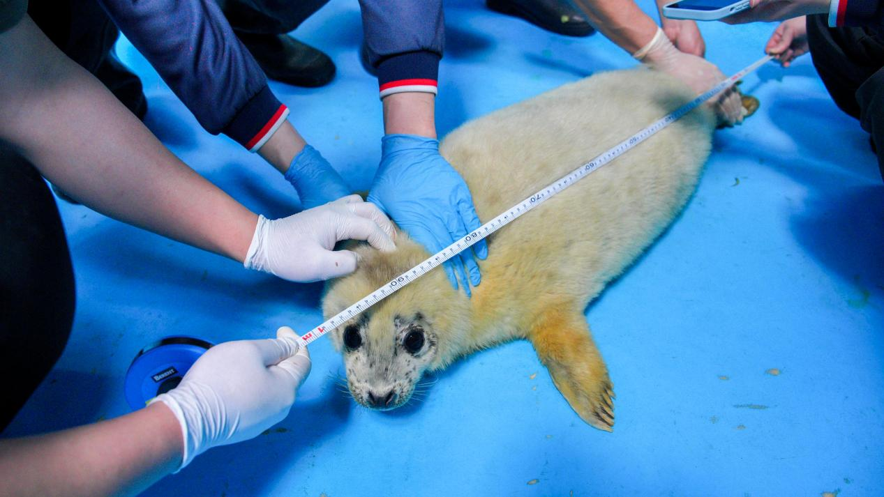 保育员正在测量小海豹的体长