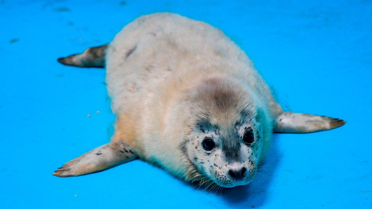 小海豹刚出生时体重近20斤,全身覆盖着白色胎毛,双眼乌黑明亮。哺乳期的小海豹主要以母乳为食,由保育员辅助喂奶,一天要进食六到八次。保育团队24小时轮班值守,详细记录其休息时间、体温、排便及进食状况。满月后,小海豹的白色长胎毛已替换为灰黑色带斑点的短硬毛,主要食物转为鲱鱼和青鱼,体重也增长到了近40斤。
