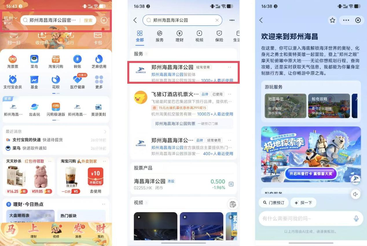 近日,郑州海昌海洋公园与支付宝联手,正式在支付宝平台上线官方旗舰店,并创新推出AI智能伴游“海小昌”,通过前沿数字技术,为游客构建从线上智能规划,到线下沉浸交互的全新体验闭环,积极响应国家“十五五”规划中对文旅产业数字化、智能化转型升级的号召,开启智慧文旅新体验。